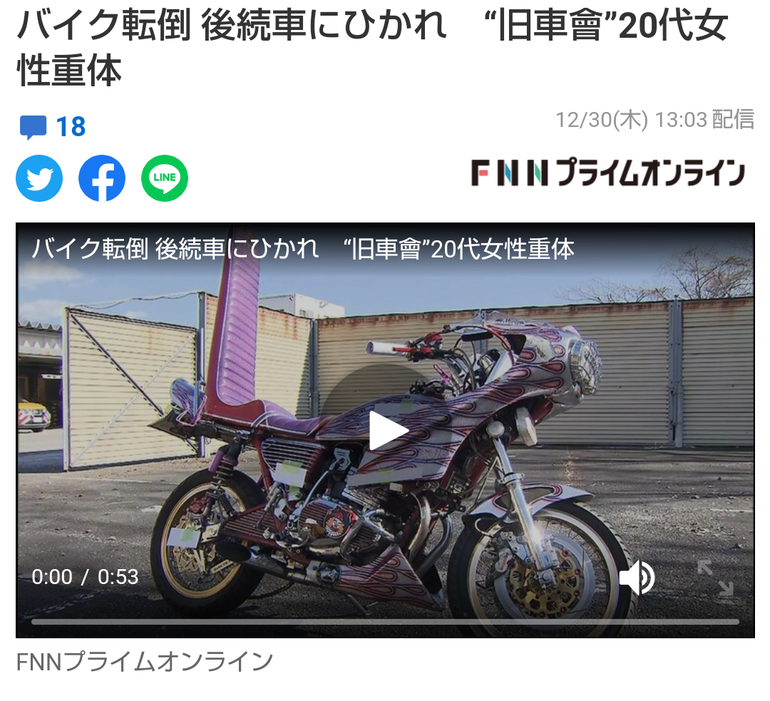 旧車會のバイカス女が転倒して後続車に轢かれて重体なんだ皆で励ましの言葉をかければきっと生き返る!