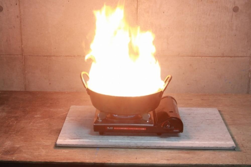 ロウソク消す時に指でつまむやん?あれって酸素を遮断するからこの鍋も同じで油と火の間に障害物をおけば消えるで。