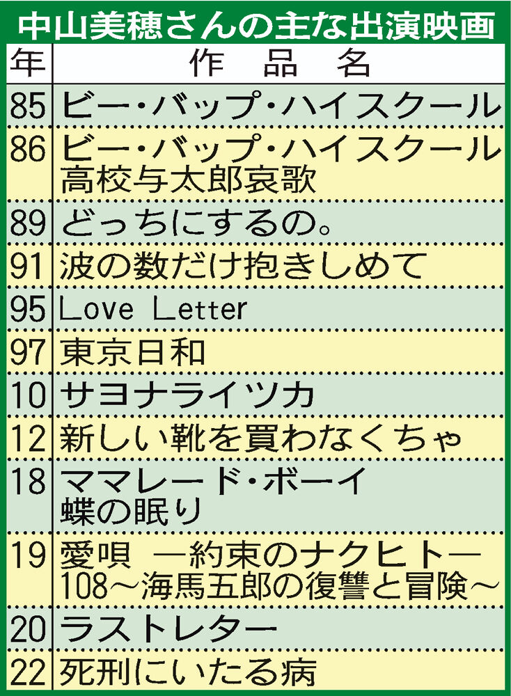 | 画像提供依頼:顔写真の画像提供をお願いします。(2024年12月) 中山 美穂(なかやま みほ、1970年〈昭和45年〉3月1日 - 2024年〈令和6年〉12月6日)は、日本の女優・歌手。東京都小金井市出身。ビッグアップル所属。愛称は「ミポリン」。 作詞家として活動する際は「北山 瑞穂(きたやま… 122キロバイト (11,611 語) - 2024年12月9日 (月) 02:02 |