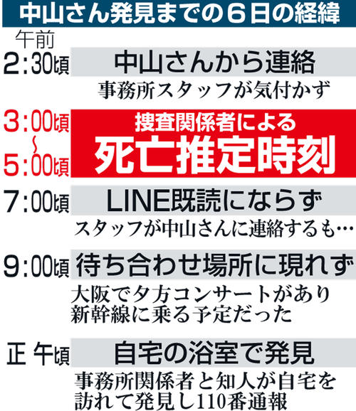 ・正午ごろ 自宅を訪れた事務所関係者らが中山さんを発見し、110番通報。死亡を確認。