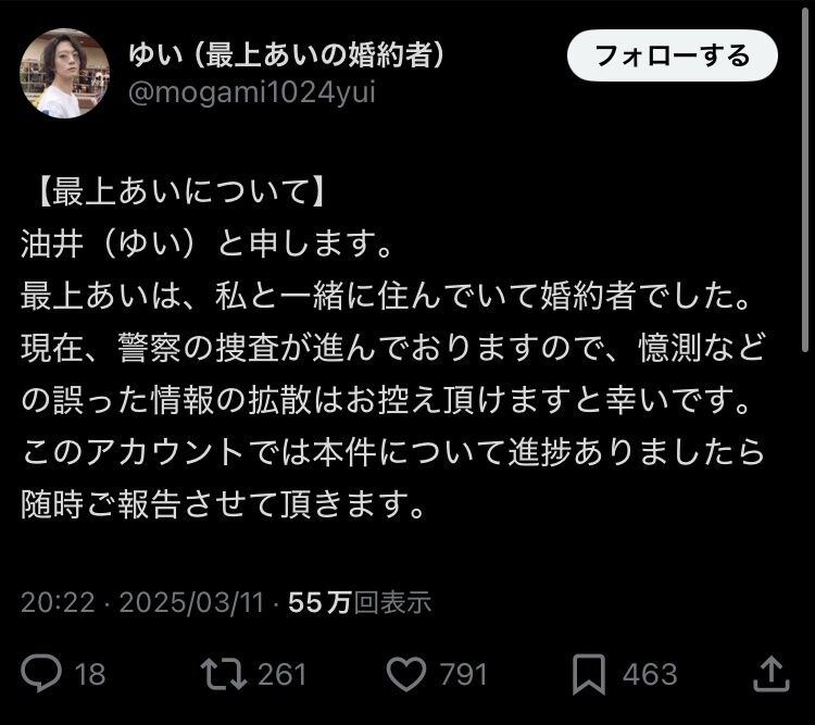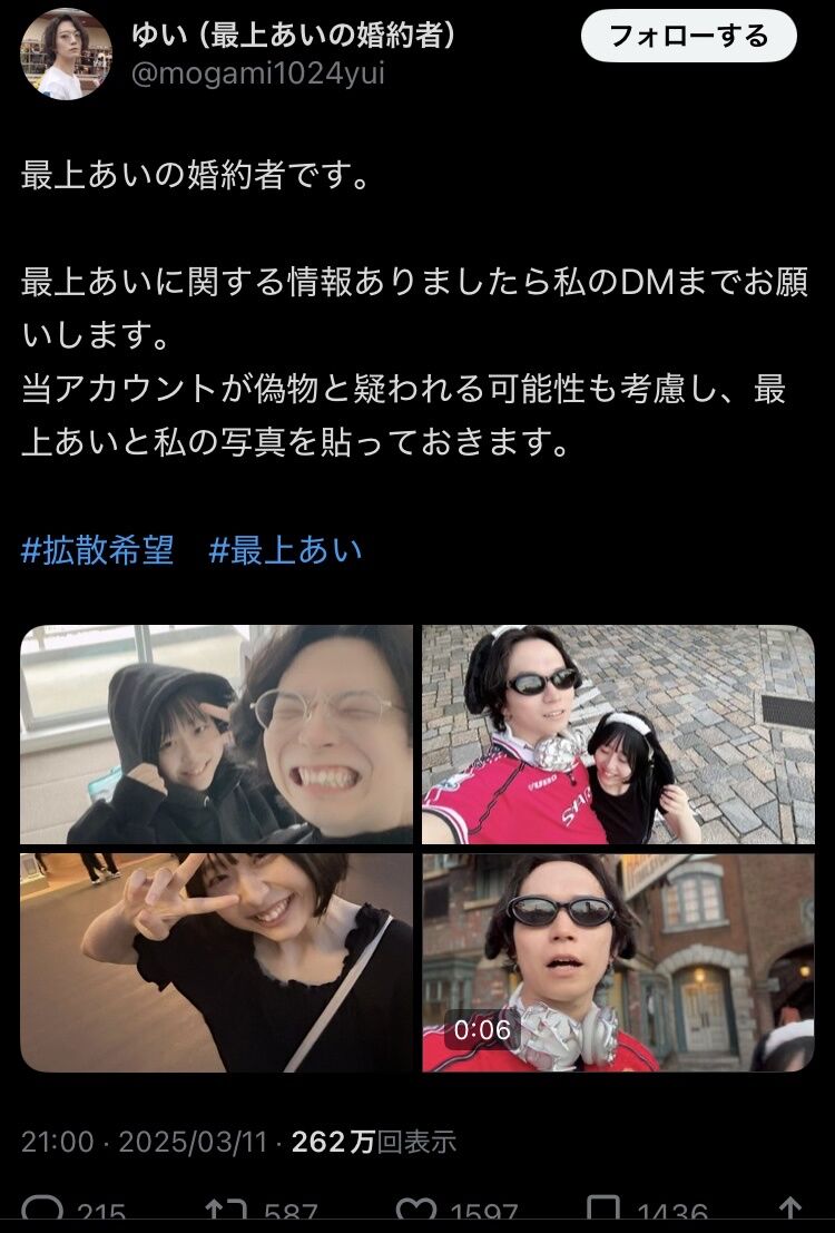 | 最上あいさんが他界 / 婚約者が画像と動画公開して世間にお願い「憶測拡散ひかえて」 - ガジェット通信 最上あいさんが他界 / 婚約者が画像と動画公開して世間にお願い「憶測拡散ひかえて」 ガジェット通信 (出典:ガジェット通信) |