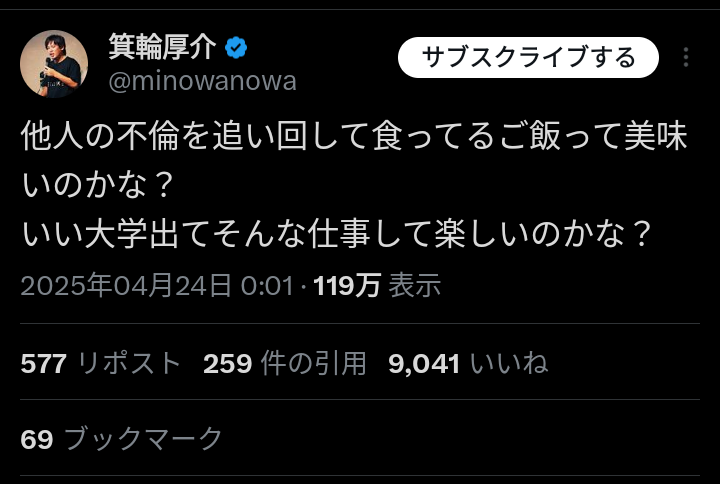 報道を受け、箕輪氏の妻が参戦し、Xでいけちゃんに意見し、他のインフルエンサーにも飛び火するなど騒動が拡大していた。