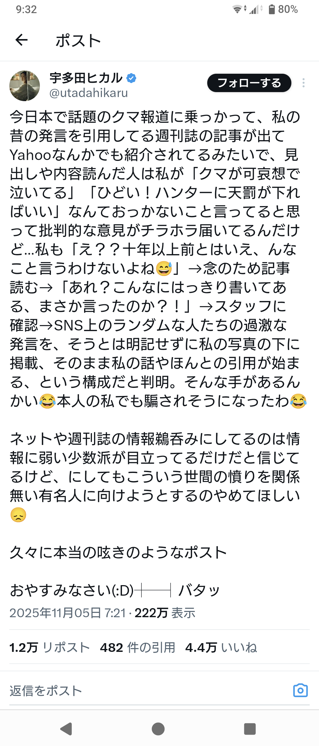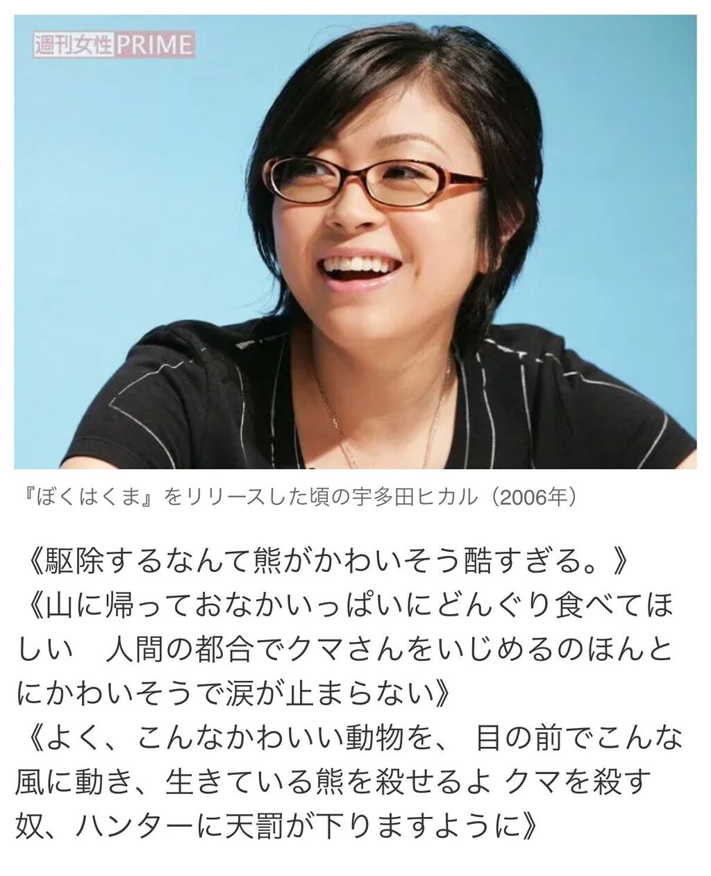 | 宇多田ヒカル、過去のクマ発言報道めぐり困惑 「本人の私でも騙されそうになったわ」 歌手の宇多田ヒカルさんが2025年11月5日にXを更新し、クマをめぐる自身の発言に関する報道への戸惑いを明かした。 ■「そんな手があるんかい」 … (出典:J-CASTニュース) |
