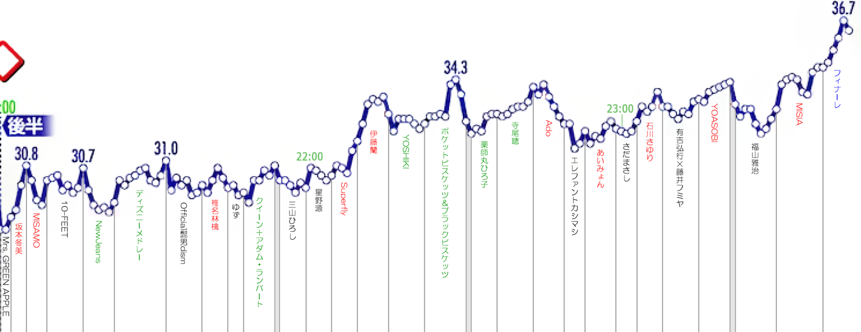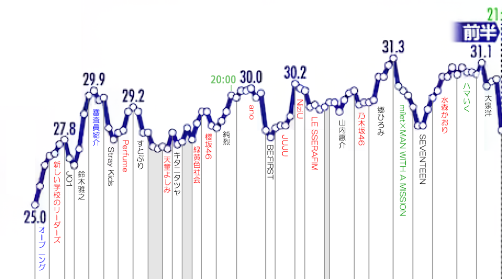 一昨年の紅白歌合戦 歌手別視聴率のグラフ