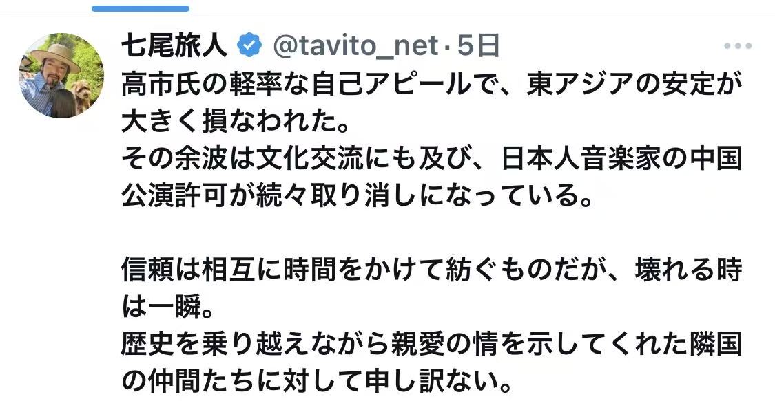 七尾は先月20日、自身のXで「高市氏の軽率な自己アピールで、東アジアの安定が大きく損なわれた。その余波は文化交流にも及び、日本人音楽家の中国公演許可が続々取り消しになっている」と言及し、「信頼は相互に時間をかけて紡ぐものだが、壊れる時は一瞬。歴史を乗り越えながら親愛の情を示してくれた隣国の仲間たちに対して申し訳ない」と思いをつづっていた。