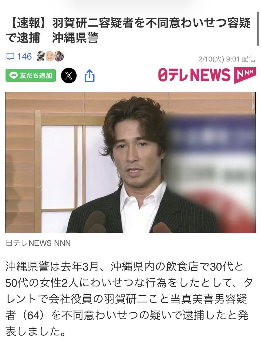 元タレントの羽賀研二が28日、不同意わいせつ容疑で2月10日に沖縄県警に逮捕されてから初めてSNSを更新した。